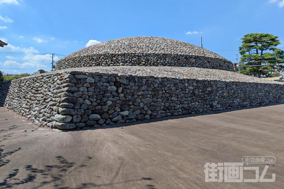 その名の通り、下段が四角い「方形」、その上に丸い「円形」という、方墳と円墳の両方の特徴を併せ持つ非常に特殊な構造になっている。その数は極めて少なく、全国でも数例しか確認されていないという極めて稀少な墳形の古墳だ。