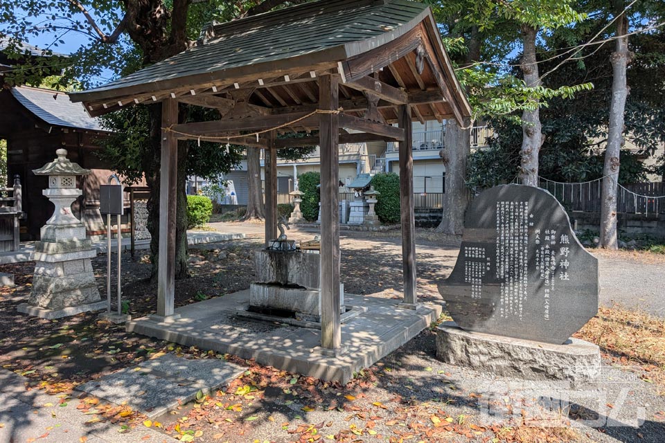 手水舎の隣には由緒碑が立ち、熊野神社の由緒を知ることができる。