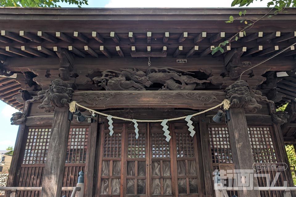 拝殿の上部に目を向けると、力強い龍の彫刻が存在感を放つ。