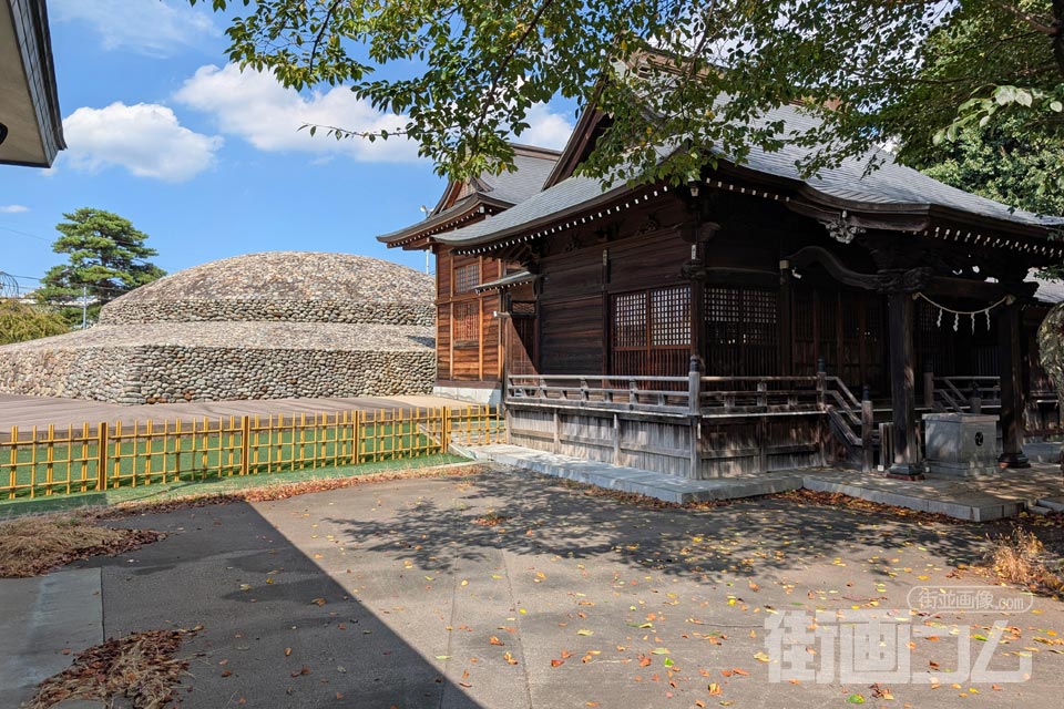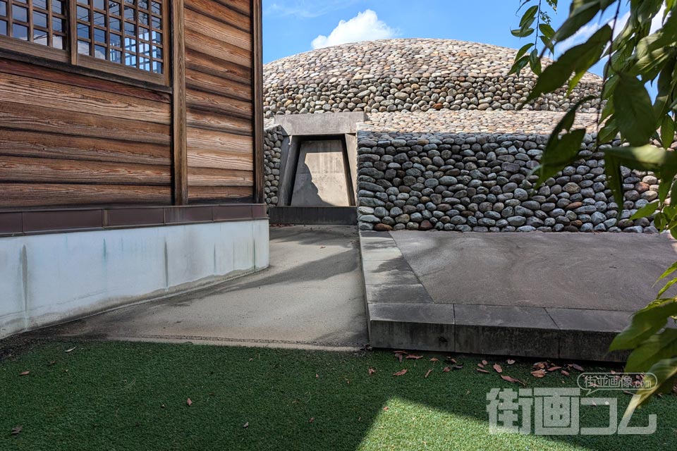 本殿の背後には、石室の入口が確認できる。現在は安全のため閉鎖されているが、内部に横穴式石室があり、そこから副葬品も出土しているという。敷地内には「石室復元展示室」も設けられており、後ほどその内部を紹介したい。