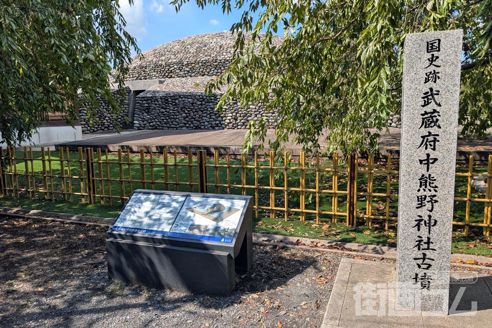 古墳の前には「国史跡 武蔵府中熊野神社古墳」と刻まれた石碑があり、横には案内板が設置されている。墳丘の概要や発掘の成果がわかりやすく説明されており、古墳ファンならずとも足を止めて読みたくなる内容だ。