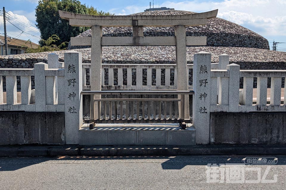 古墳の反対側にまわると、石の鳥居が立ち、また違った趣の風景が広がる。神社を取り囲む玉垣と古墳が重なり合う独特の空気を感じることができる。