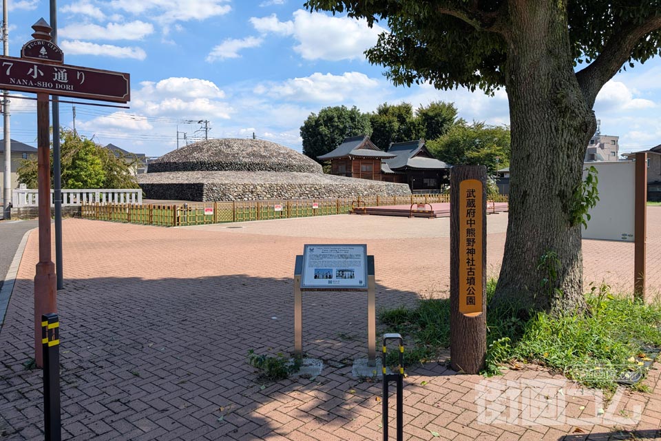 古墳の北西側、7小通り沿いには「武蔵府中熊野神社古墳公園」が整備されている。こちら側からは、古墳全体の形を確認することができる。