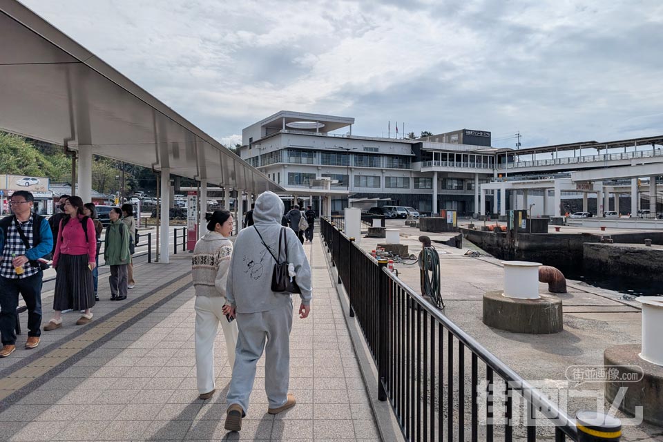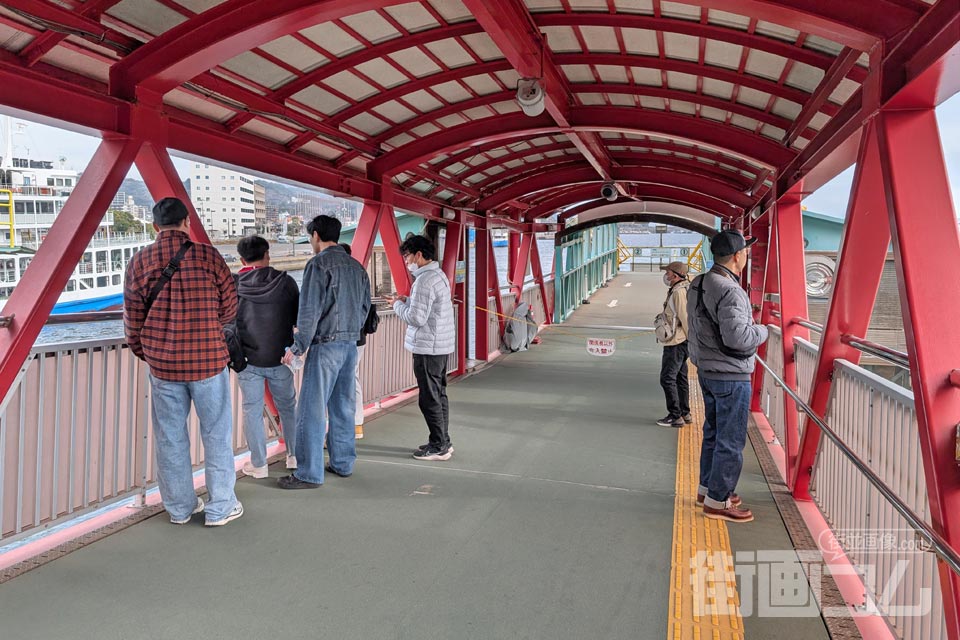 乗船口となる桟橋へ向かうと、すでに次の便を待つ人々が集まっていた。「1便見送ったばかりなのに」と驚くかもしれないが心配は無用。桜島フェリーは旅客定員が非常に多いため、この程度であれば全員が余裕で乗船できる。