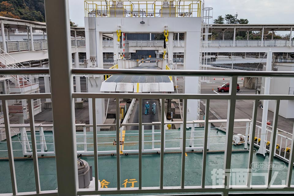 フェリーが所定の位置に着くと、車両を積み込むための可動式の橋が船へとかけられる。この光景が、これから海を渡るという非日常感を一気に高めてくれる。