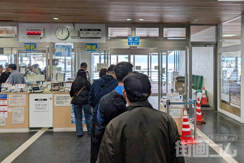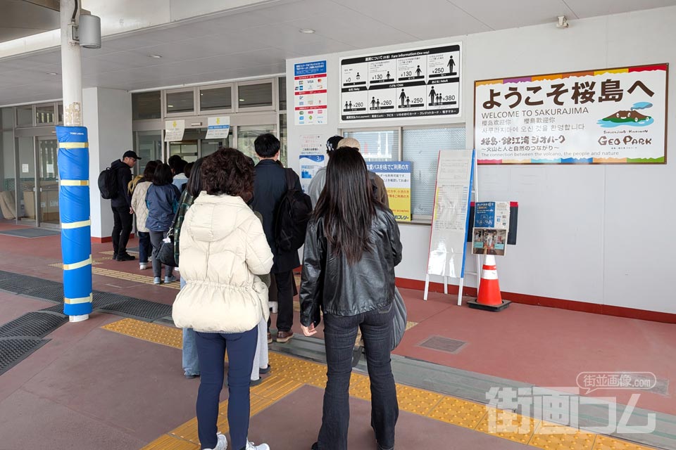 帰りのフェリーに乗船するため、改札口へと向かう。改札口の前にはフェリー乗船を待つ人々の列ができている。行きは桜島に着いてから運賃を支払ったが、帰りもここ桜島港の改札で乗船前に運賃を支払うシステムとなっている。