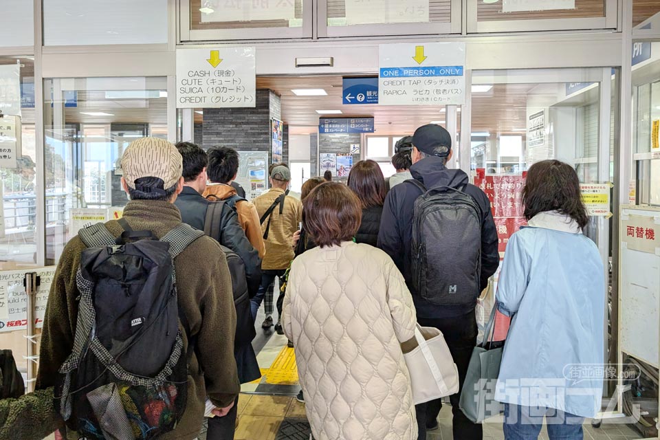 フェリーから降りた乗客が一斉に向かうため、一時的な行列ができるが、キャッシュレス決裁も可能なため流れは比較的スムーズだ。ここで無事に運賃を支払い改札を抜ければ、いよいよ桜島の大地へ上陸となる。