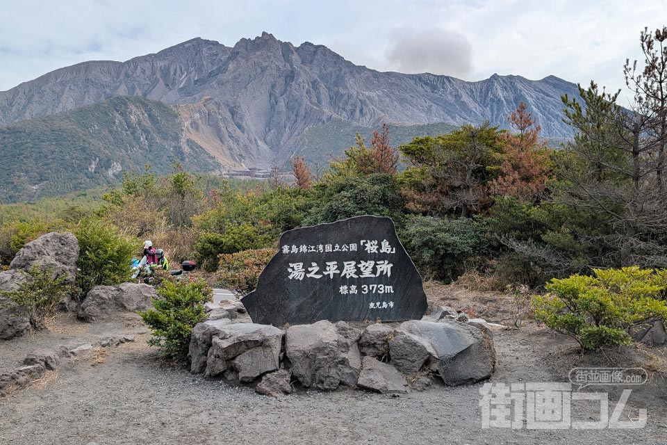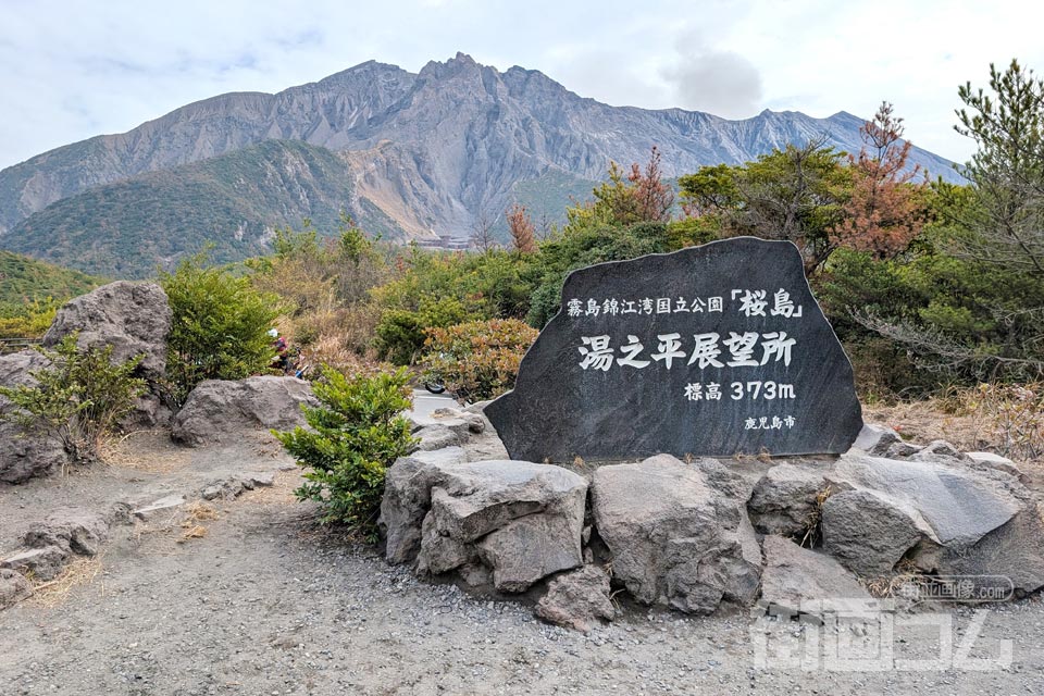 展望所の前には立派な石碑が建っており、そのバックには雄大な桜島がそびえ立つ。まさに「桜島に来た!」という実感が込み上げてくる、絶好の撮影スポットだ。