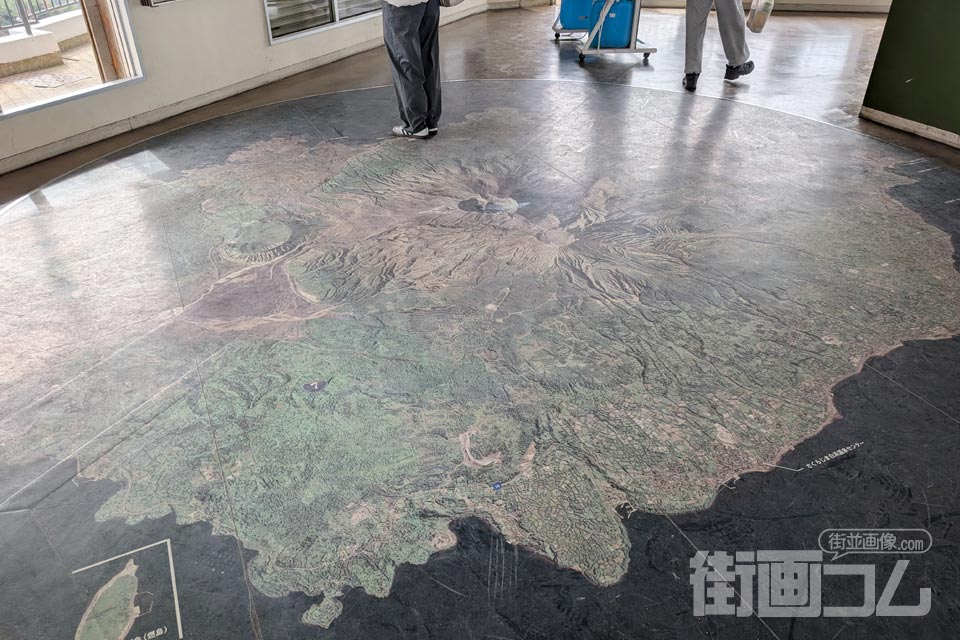 展望フロアの床には桜島の広大な航空写真がプリントされている。自分が今、この巨大な火山のどの位置に立っているのか、空からの視点で確認できるちょっとした遊び心も面白い。