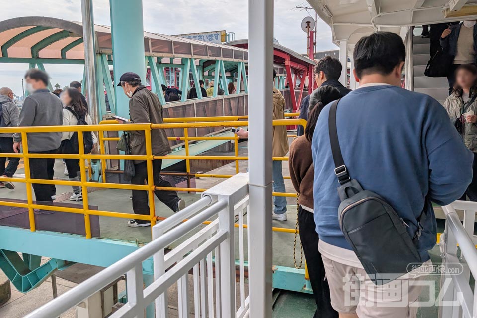 橋の準備が整うと、いよいよ乗船開始だ。列に並んでいた人々が、続々と船内へ進み始める。