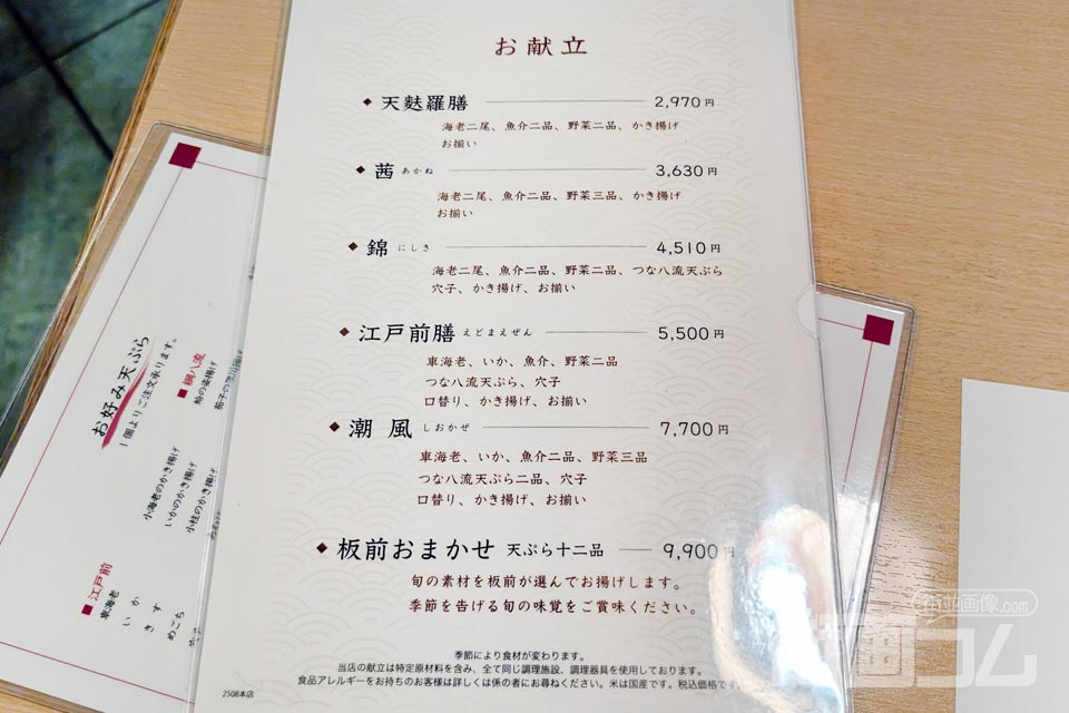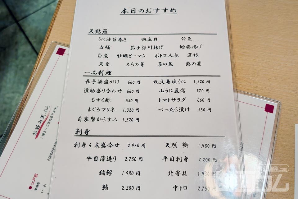 店内に入ると、まずは待ちスペースへ案内される。そこには、人気No.1コース「江戸前膳」の案内が掲示されていた。