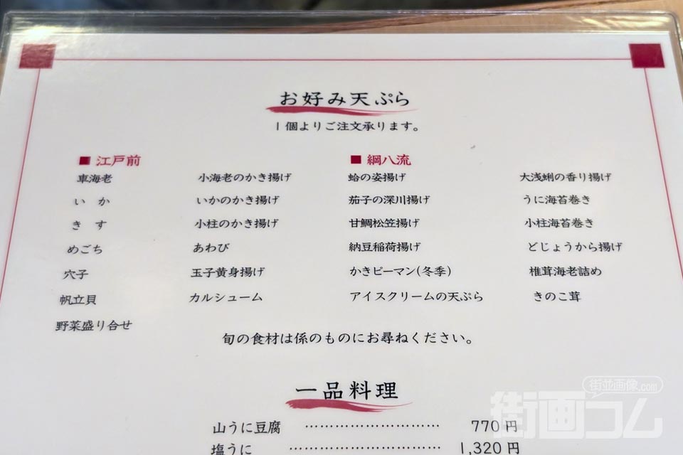 「お好み天ぷらメニュー」には、定番なタネがずらり。お腹の具合と相談しながら好きなものを一品から追加することができる。