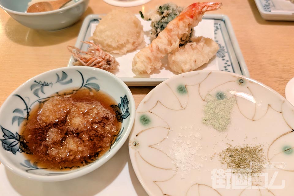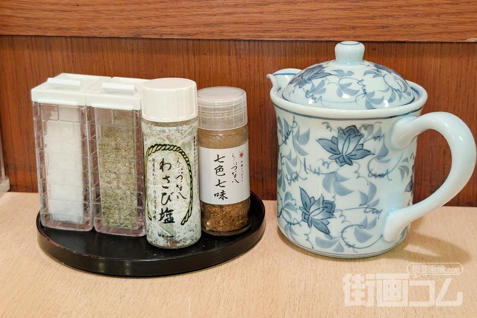 テーブルの上には、塩・昆布塩・わさび塩・七色七味、そして天つゆといったものがひと通り揃う。