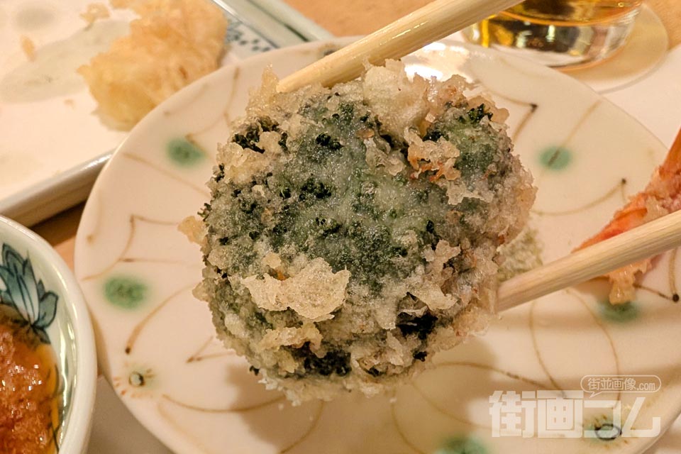 意外性のあるブロッコリーの天ぷらは、揚げることでホクッとした食感が生まれ、普段とは違った一面を楽しめる。軽く塩をつけるだけで、野菜の旨みがぐっと引き立つのも印象的だ。