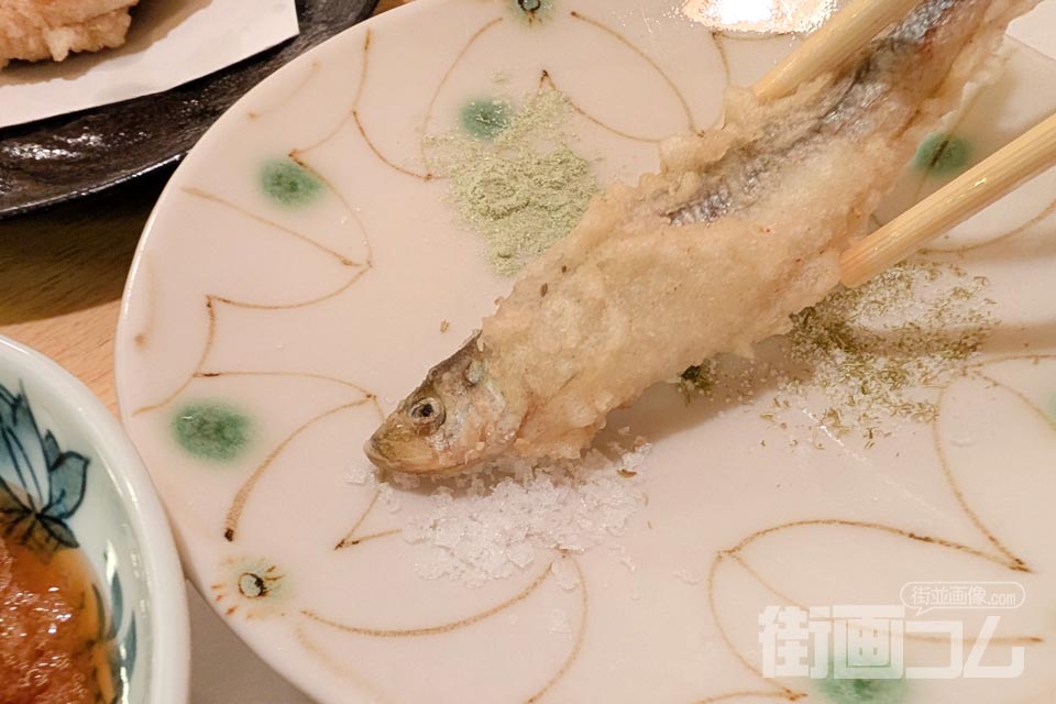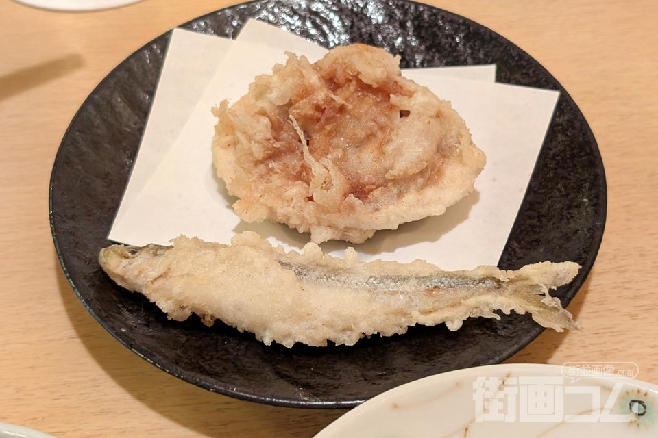 続いて登場したのが、「魚介」と「つな八流天ぷら」を担う一皿。この日の内容は、ワカサギとハマグリというこの季節らしい組み合わせだった。