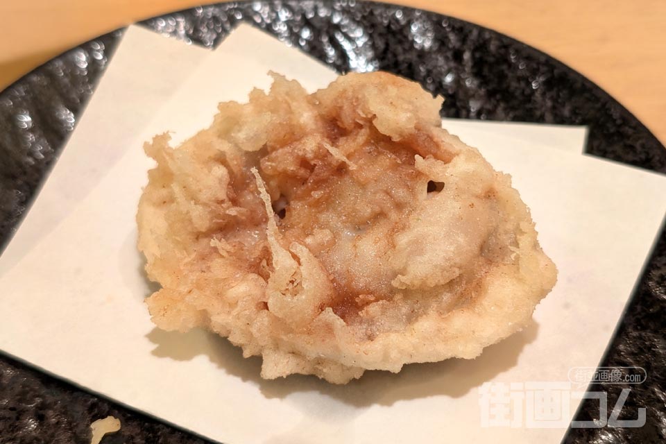こちらは「つな八流天ぷら」として提供される一品で、貝殻ごと豪快に揚げられているのが印象的。