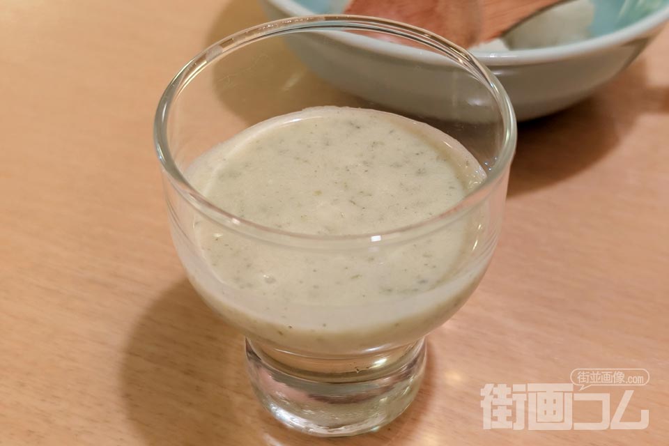 ひんやりとした口当たりが心地よく、ここまでの油の余韻をすっとリセットしてくれる。じゃがいものやさしい甘みと青ネギの風味がバランスよく重なり、ほっとひと息つける一品だ。
