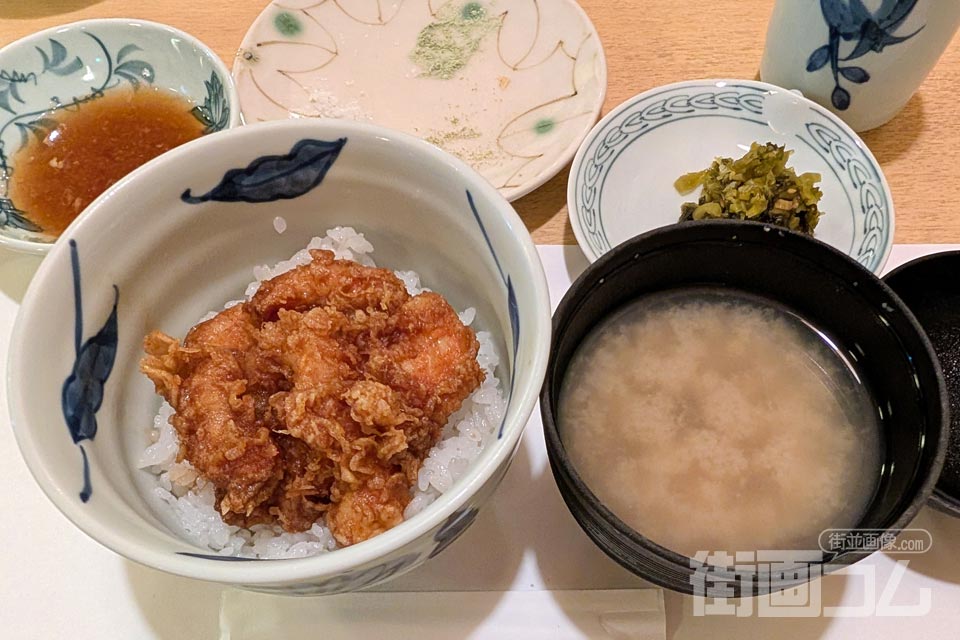 コースの締めに登場するのが「お揃い」として提供される「かき揚げ天丼」と「しじみの味噌汁」、そして「漬物」のセット。江戸前膳の最後を飾るにふさわしい充実した一膳だ。