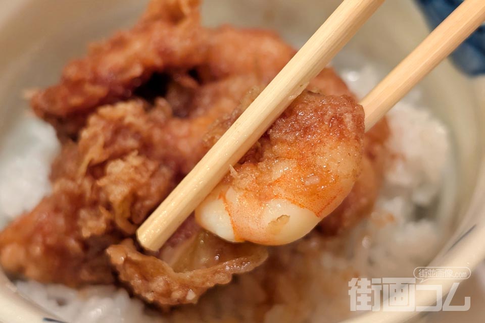 丼いっぱいにのせられたかき揚げは、サクッと軽やかな衣の中に具材の旨みがぎゅっと凝縮されている。タレは濃すぎず、天ぷらの風味を引き立てる絶妙なバランスで、最後まで飽きずに食べ進められる。