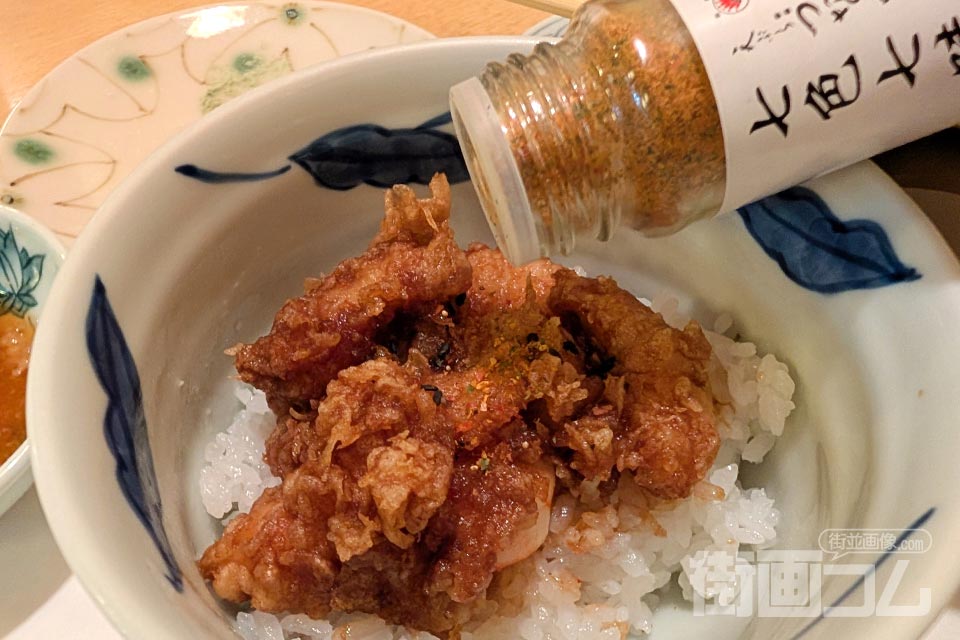 お好みで七色七味を振りかければ、ピリッとしたアクセントが加わり、味の変化も楽しめる。